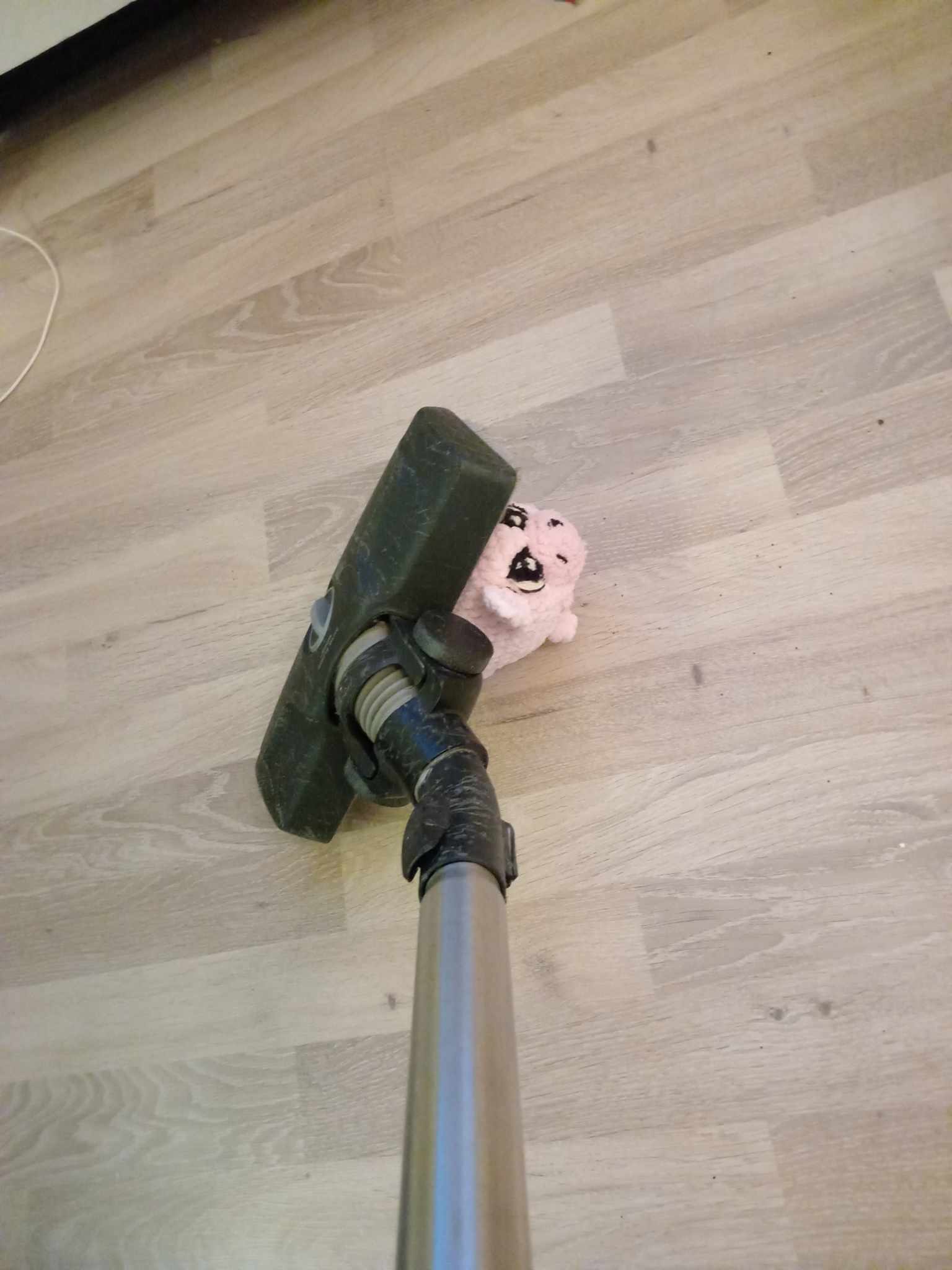 Joulukuun seitsemäs aamu oli jo pitkällä ja emäntä oli saanut käydä ainoastaan vessassa yksin. Emäntä oli keksinyt kantaa Muppea olallaan, kun oli kyllästynyt sen “odota” huutoihin perässään. Mupelle ei myöskään sopinut se, että emäntä olisi vain jättänyt sen johonkin ja tehnyt asioitaan. Muppe oli syönyt jo aamupalan kerran ja toisten kanssa yhdessä toistamiseen. Emäntä oli ladannut pyykkikoneen ja Muppe oli tietysti halunnut auttaa pyykkinesteen kaadossa. Muppe tietysti pienenä possuna oli onnistunut kallistamaan liian isoa pulloa liikaa, niinpä pesuainetta oli valunut yli laitojen. Muppe oli imuroinut emännän kanssa ja onnistunut hyppäämään imurin suuttimeen juuri kun emäntä nosti suutinta lattiasta ja imuri imaisi Mupen. Onneksi Muppe oli sen verran pyöreä, ettei se imeytynyt pitkin putkea roskien mukaan, vaan jäi imurin suulle jumiin. Muppe oli suuttunut imurille ja röhkinyt sille kiukkuisena. Emäntä oli joutunut jättämään imuroinnin kesken ja lohduttamaan pientä kiukkuista, loukattua possua, koska se ei muuten olisi lopettanut kiukkuista röhkimistään.