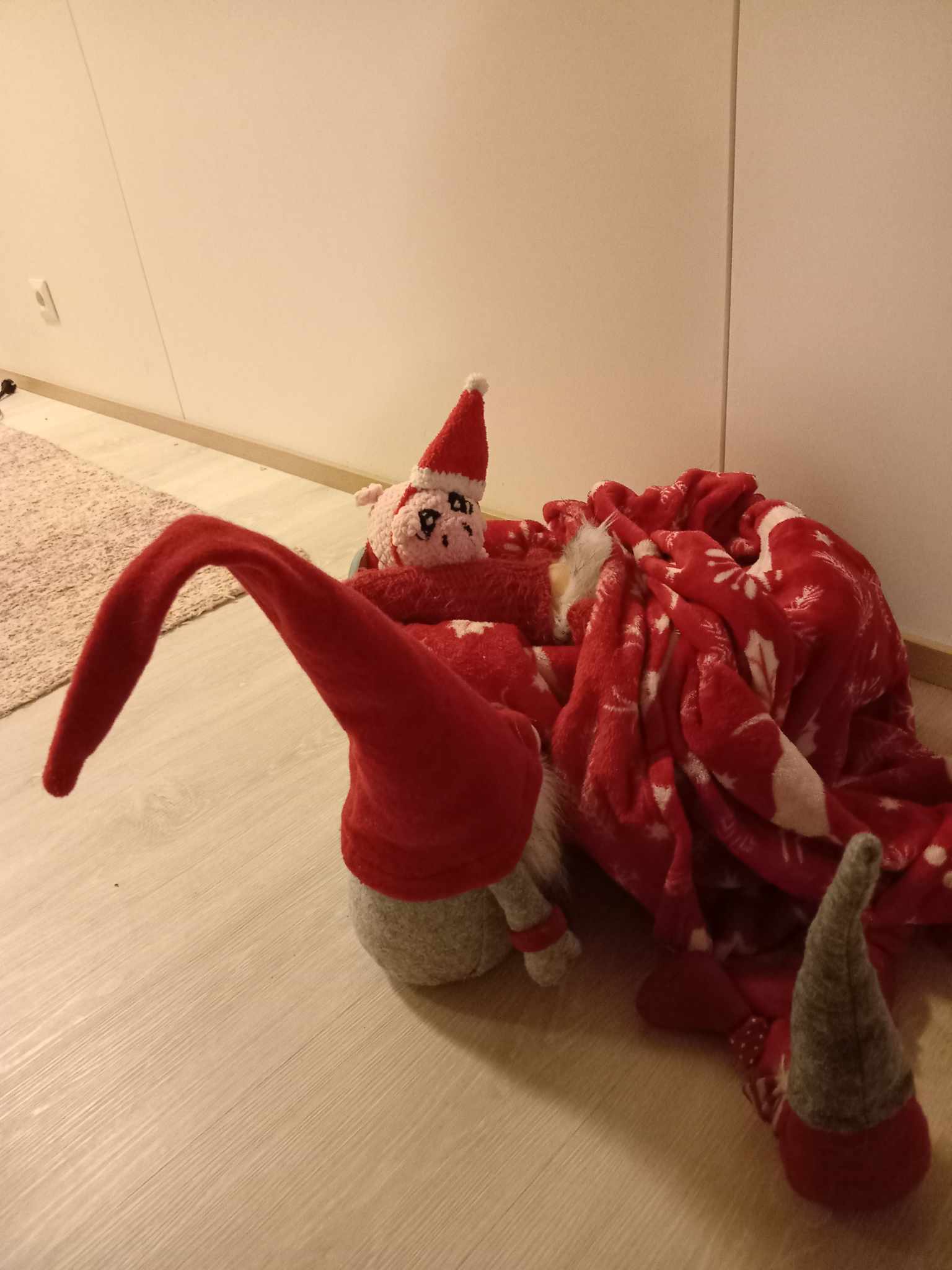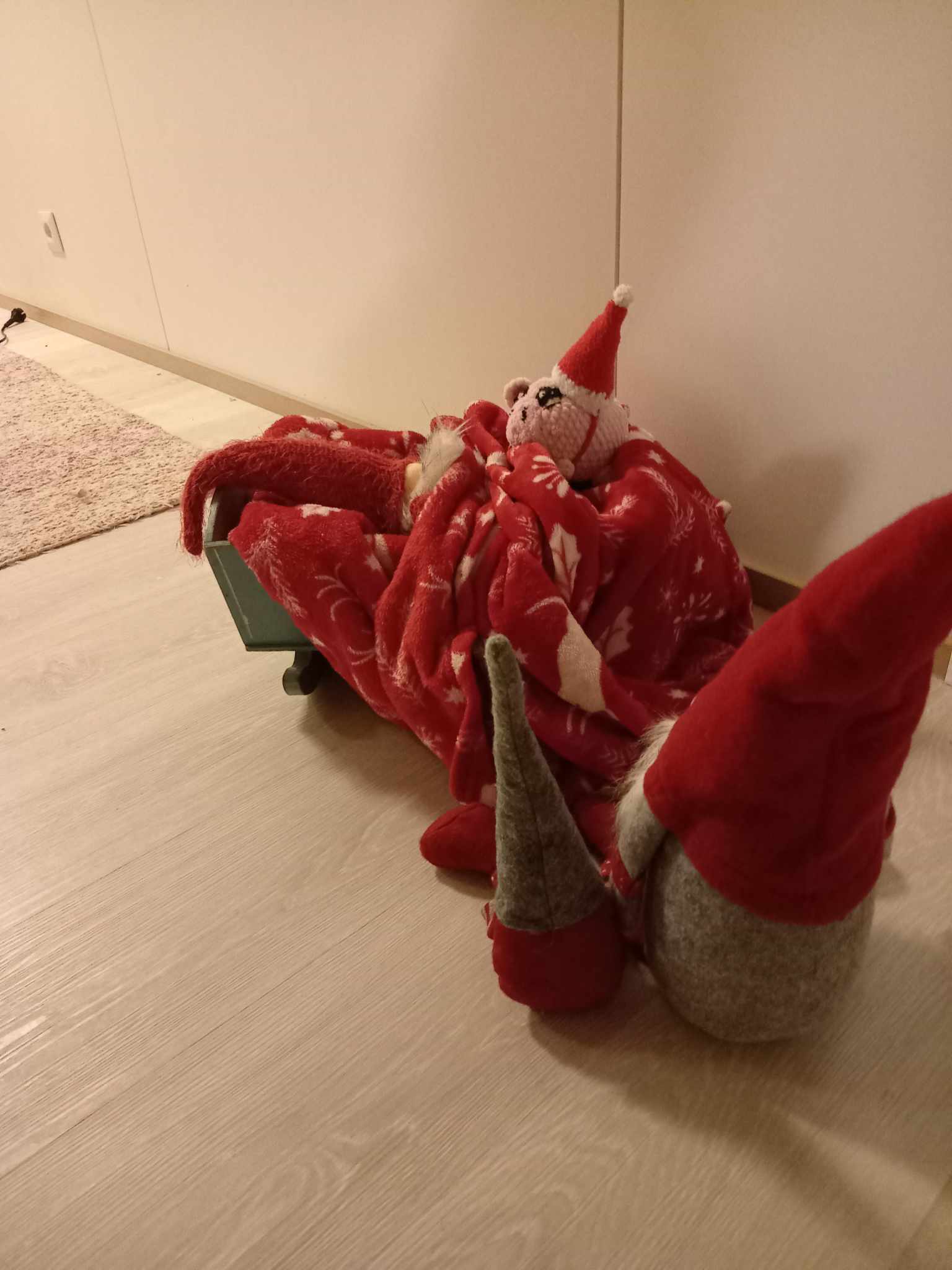 Kaikkien onneksi ketään ei kuitenkaan tullut heti aamusta, eikä päivästäkään. Lapsetkin ehtivät kotiin ja edelleen talossa odotettiin. Pieni potilaamme oli ollut niin onnellinen kuullessaan pääsevänsä kotiin, vaikka oli ollut niin kiitollinen saamastaan hyvästä hoidosta talossa. Alkuillasta tonttujen kyytiä odotettiin yhä ja loppujen lopuksi kaikki joutuivat käymään pettyneinä nukkumaan myöhemmin illasta. Mihin se kyyti oikein oli jäänyt???