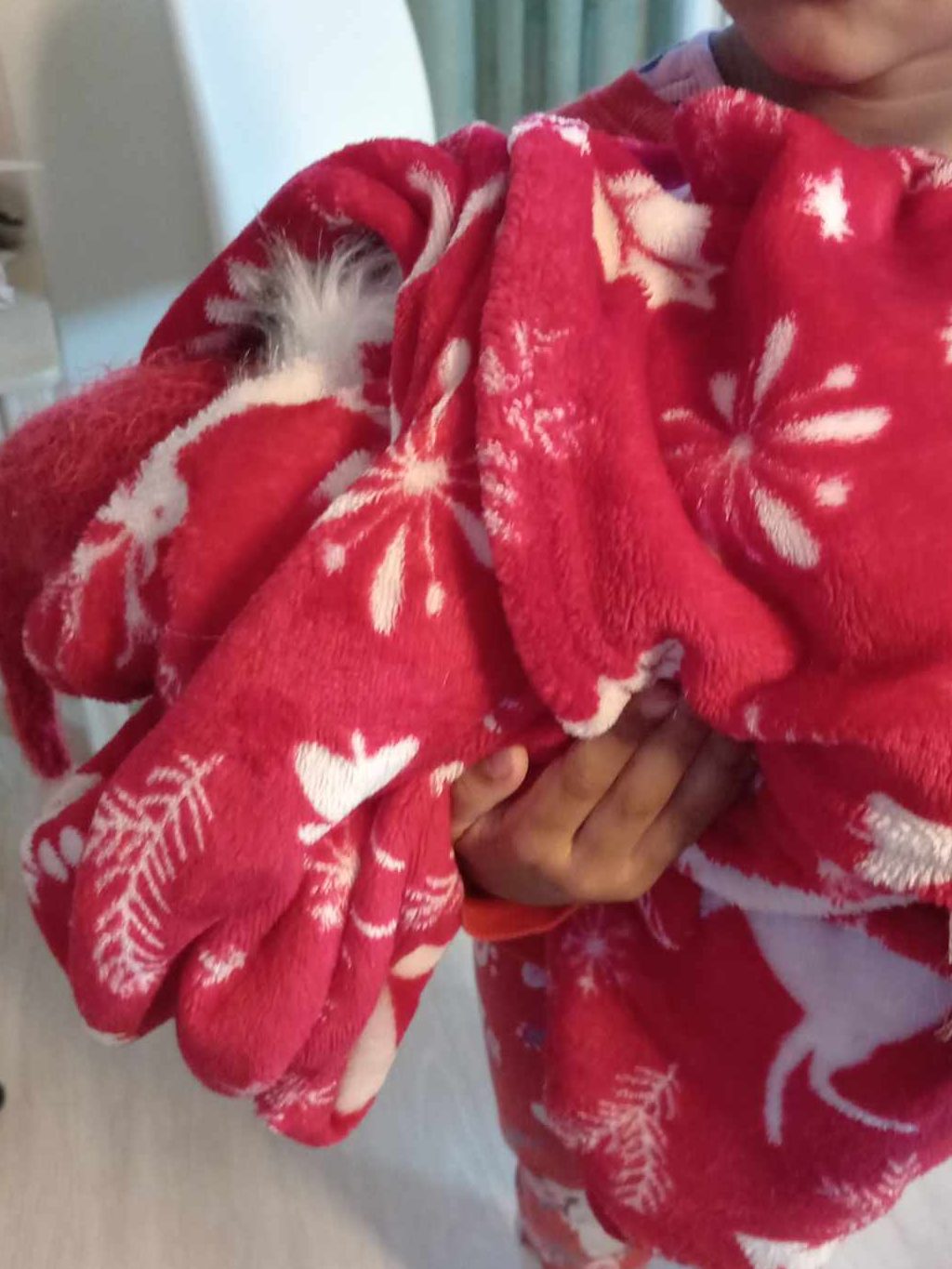 Taavetti-tonttu oli lähtiessään hereillä, mutta unelias. Pienin lapsi oli käärinyt sen lämpimään peittoon matkaa varten ja kantanut Taavetin ulos rekeen.