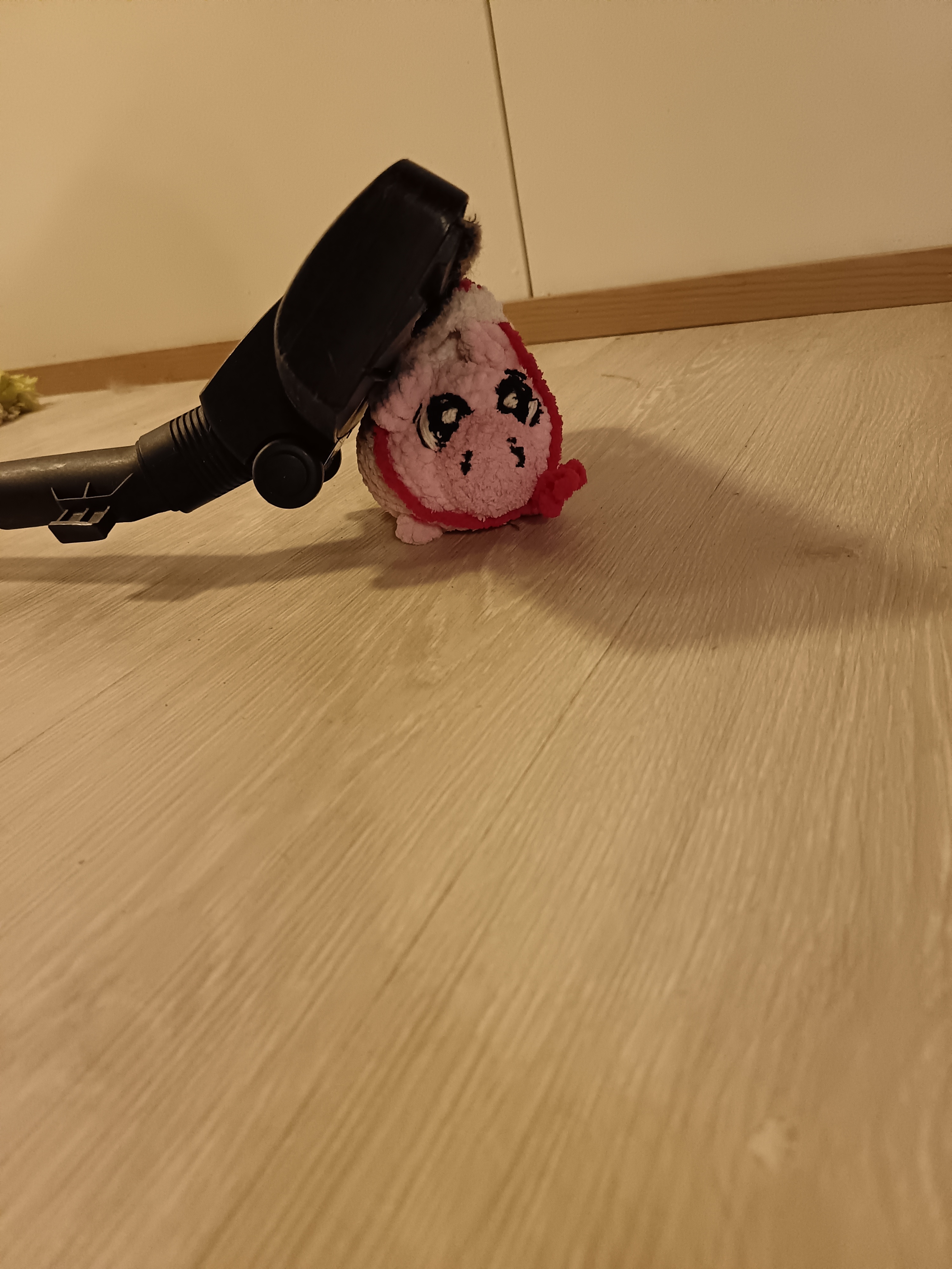 Muppe hyppäsi imurin päälle ja vetäisi johdon ulos. Se oli kyllä ihmeen painava. Imurikin oli, mutta ehkä hän tarvitsi vain vähän harjoitusta. Muppe oli varma, että oppisi kyllä vielä oikean taktiikan. Emäntä tulisi olemaan vielä niin ylpeä siitä. Muppe tönäisi imurin letkun ja suuttimen lattialle ja siitä kuului kauhea räsähdys, kun se putosi lattialle. Muppe laittoi johdon seinään ja hyppäsi taas imurille painamaan käynnistysnappia. Se alkoi hurisemaan. Muppe hyppäsi suuttimelle ja koitti nostaa sitä lattialta pystyyn. Se painoi kuitenkin niin paljon, ettei Mupen voimat riittäneet. Muppe ajatteli, että jos irrottaisi sen ison suuttimen ja yrittäisi pelkällä letkulla, niin kuin oli emännän nähnyt tehneen välillä imuroidessaan. Muppe yritti irrottaa sitä ensin letkun varresta, muttei sekään onnistunut. Jos Muppe vetäisi suuttimesta oikein kovaa, niin se varmasti irtoaisi. Niinpä Muppe meni suuttimen eteen ja aikoi vetää niin kovaa, kun pystyi. Imuri kuitenkin vetäisi Muppe raukan suuttimeen kiinni ja yritti kaikin voimin saada Mupen sisäänsä. Imuri huusi tukoksesta ja Muppe huusi paniikissa. Onneksi Muppe oli liian iso aukkoon, mutta se oli täysin jumissa siinä. Yhtäkkiä imuri imaisi Mupen tonttulakin sisäänsä äänekkäästi. Samassa Björn oli tullut paikalle ihmeissään kauheasta metelistä ja huudosta.