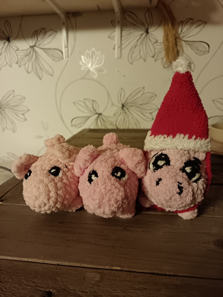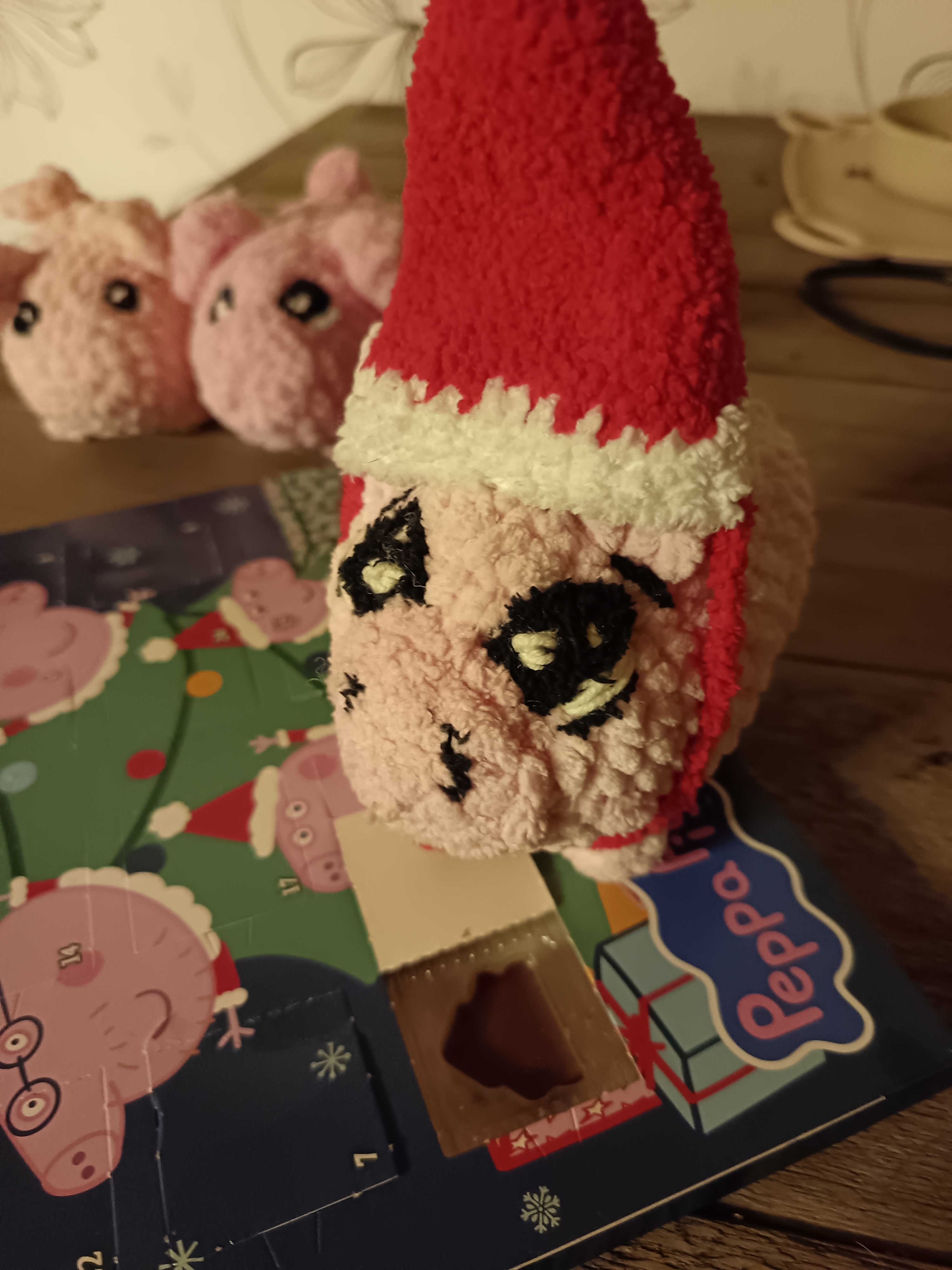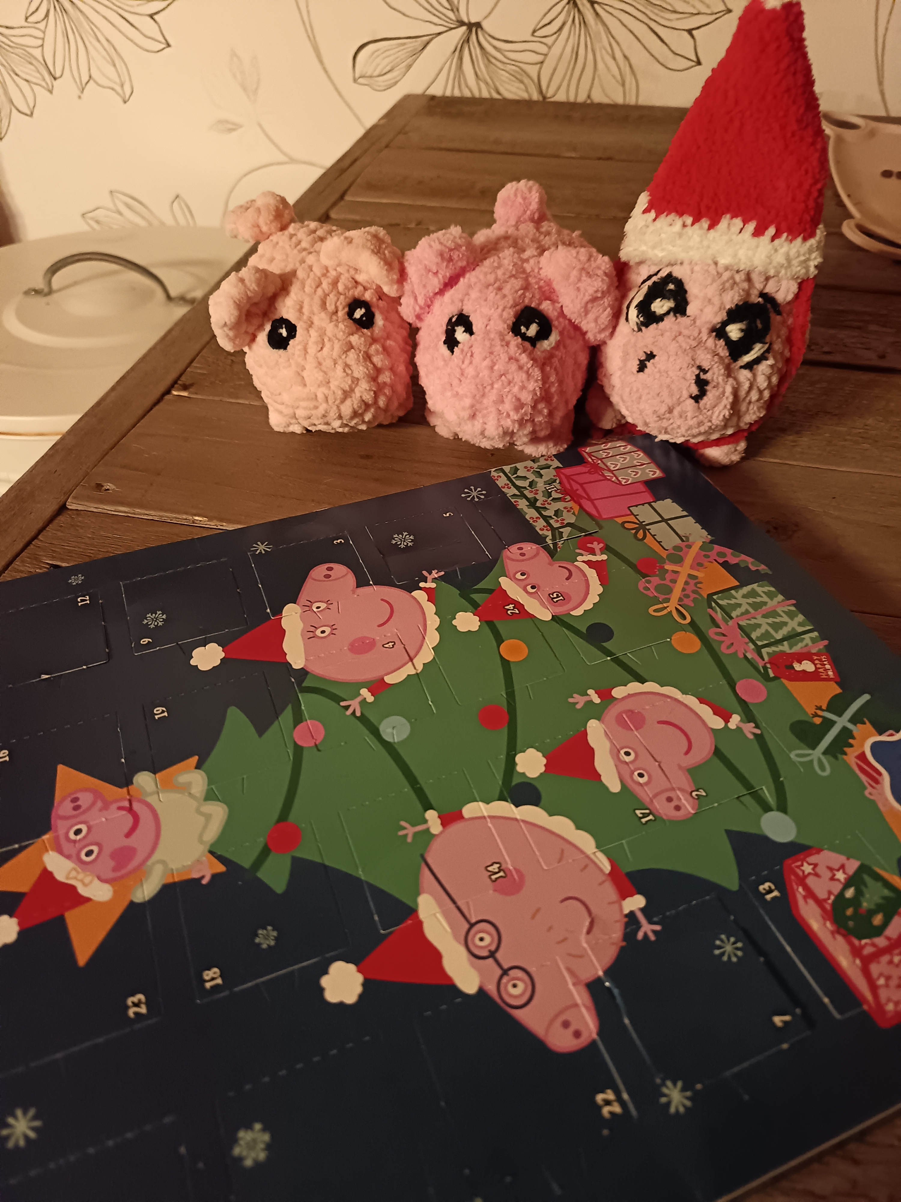 Emäntä palasi virkkuupuuhiinsa ja kuunteli kuinka Muppe kertoi toisille talon parhaat osat. Muppe oli puhunut ja puhunut. Välillä Mupen äänen välistä kuului satunnainen “okei” tai vain pieni hymähdys. Olipa toiset hiljaisia. Muppe oli kovin toivonut taloon tänäkin jouluna possuja ja nyt kun niitä oli, ei niillä oikein tuntunut löytyvän yhteistä säveltä. Emäntä muisti viime vuoden possukoplan, niillä oli ollut aina niin kivaa yhdessä ja jo heti alusta ne olivat olleet niin tiiviisti ystäviä keskenään. Muppe soitteli edelleen vanhojen ystäviensä kanssa. Muppe oli siirtynyt keittiöön uusien possujen kanssa, kun emäntä ajatteli, että niitä pitäisi vähän avittaa. Muppe esitteli juuri suklaakalenteriaan toisille.