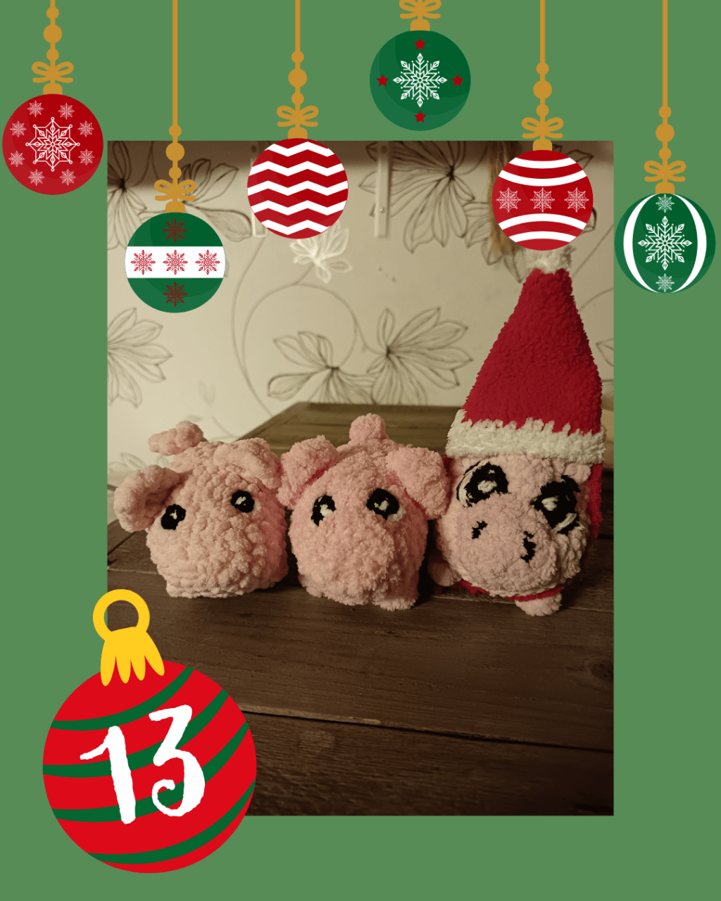 On jo 13. päivä, jouluaattoon on enää 11 aamua, Muppe laski tarkkaan suklaakalenterinsa avaamattomista luukuista. Eilinen retki oli edelleen ihanasti Mupen mielessä. Muppe oli koko illan kertonut kotona toisille mitä oli nähnyt ja kokenut. Kuinka hienoja joulukoristeita siellä olikaan ollut ja ainakin sata joulukuusta ympäri kauppakeskusta. Ei Muppe niitä laskenut ollut, mutta niitä oli kaikkialla. Ja kuinka kauppakeskuksessa oli taatusti koko maailman ihmiset, Muppe oli varma siitä. Emäntä oli nauranut, ettei sentään niin paljoa ihmisiä, mutta pieni possu oli niin varma asiasta, ettei sen päätä käännetty niin vain. Muppe oli säästänyt suklaapukkinsa tähän päivään. Tänään oli kuitenkin lauantai ja yleensä lauantaisin järjestettiin jotain kivaa. Muppe oli jo ehdottanut emännälle jouluelokuvan katsomista illalla, siinä kohtaa makea pukki olisi täydellinen elokuvaherkku. Myös viime viikonlopun juhlien popparit oli Mupen mielessä, niitä olisi haettava kaupasta.