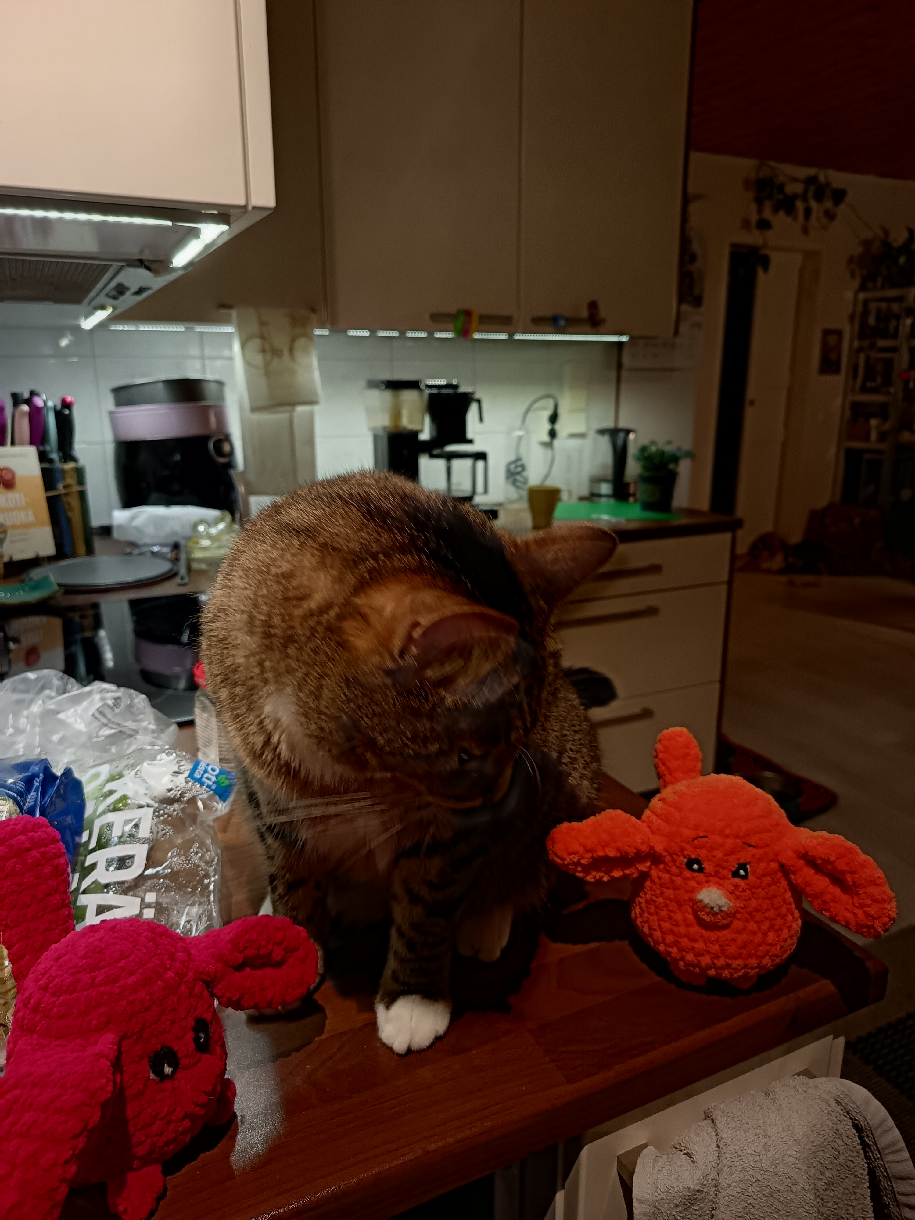 Riivilöt olivat alkaneet tänään seurata nuorinta kissaa. Mitä se tekikin, Riivilö joukko oli taatusti mukana. Emäntä oli tuonut kanalaan salaatteja kaupasta ja kissa uteliaana kiipesi pöydälle hauskan kuuloisia pusseja katselemaan. Kissa pureskeli mielellään aina pakkauspusseja ja niin se teki tälläkin kertaa. Riivilöt matkivat sitä ja pureskelivat myös pussia kulmasta. Emäntä nosti pussit toiseen paikkaan pöydälle, mutta kissa ja sen fanijoukko seurasi. Taas purtiin pussin kulmaa, kunnes emäntä nappasi salaatit ja avasi pussit huokaisten kissalle.
