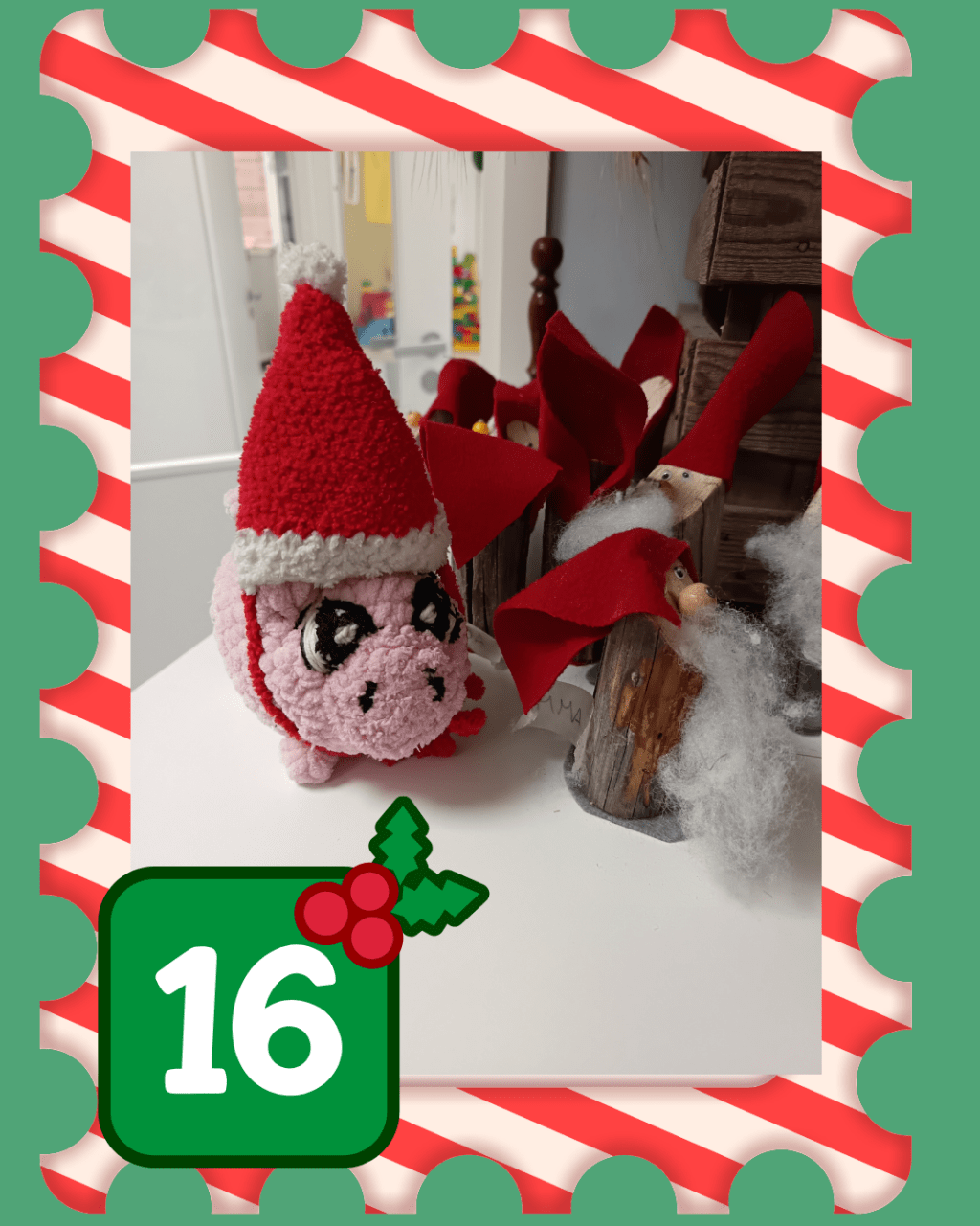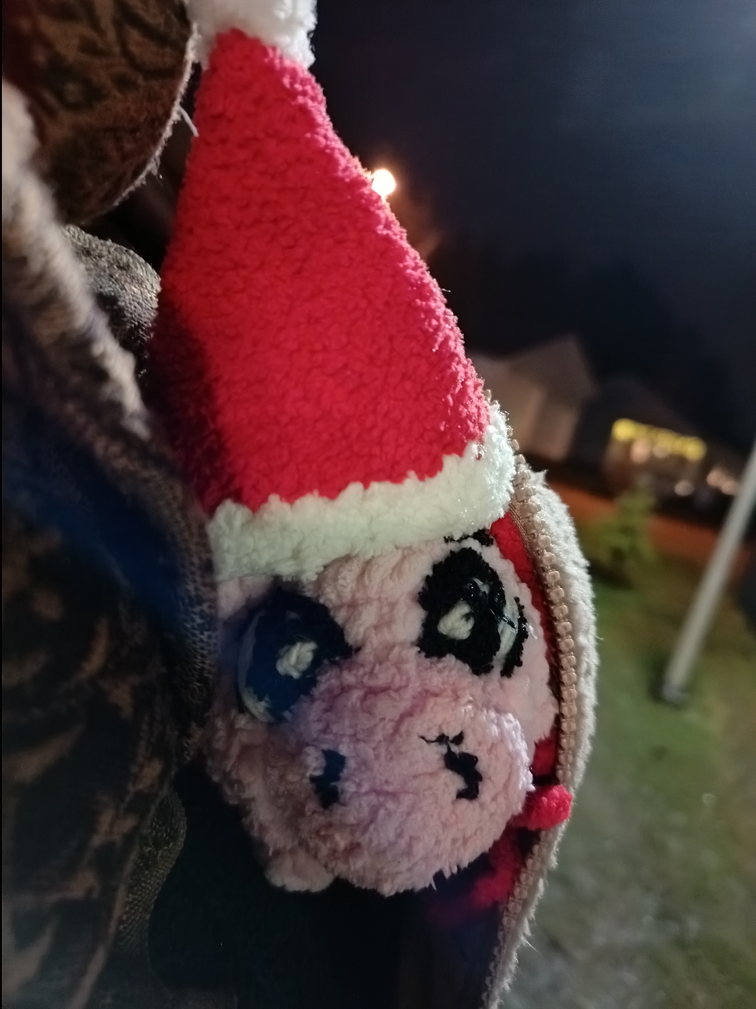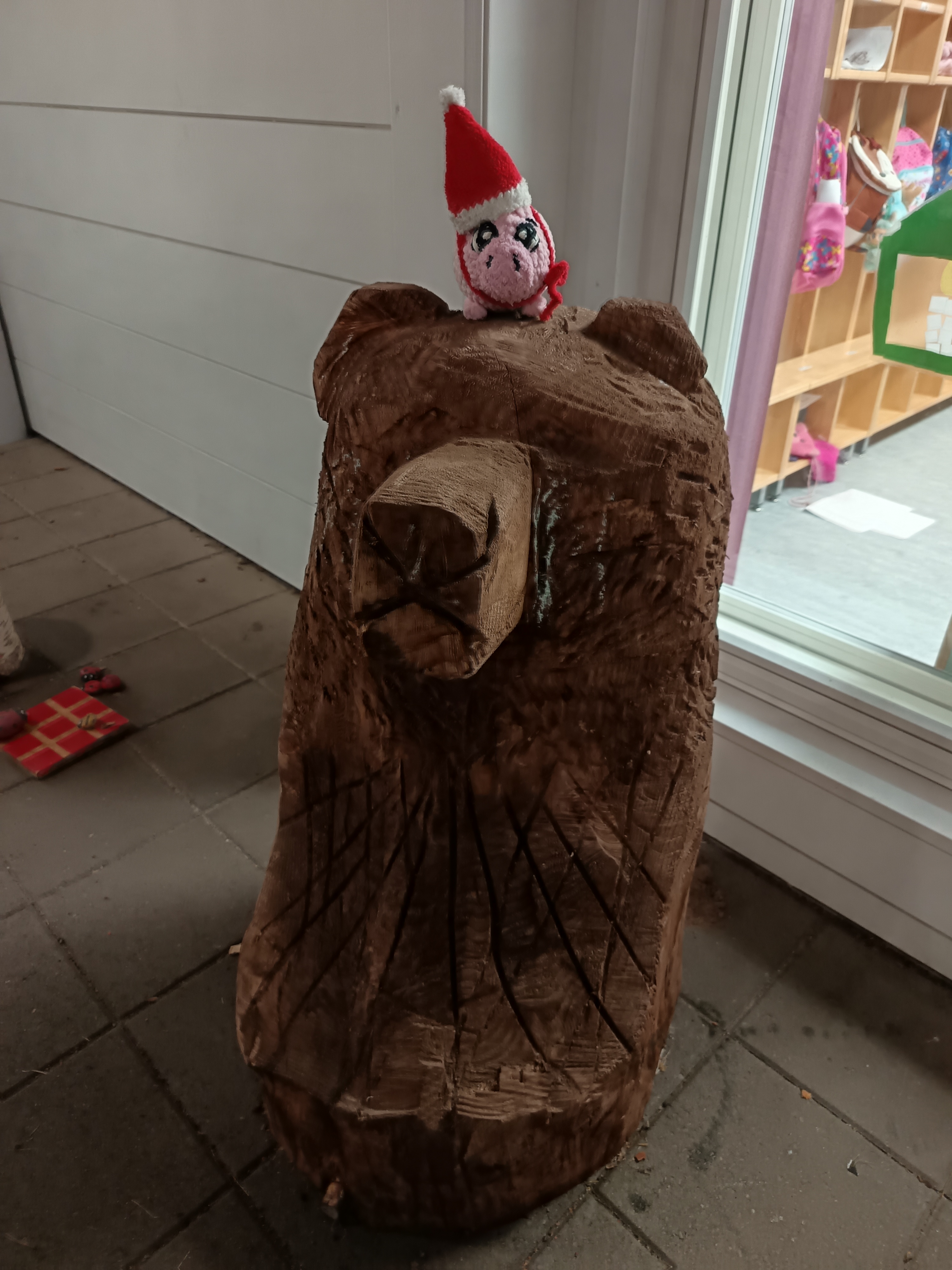Kylällä ja päiväkodilla sentään oli valot. Muppe ihaili kauniisti koristeltuja taloja ja katuja. Päiväkodin ikkunoissakin oli koristeita. Ulkona seisoi hieno puusta tehty karhu, Muppe halusi sen kanssa kuvan. Sitä voisi esitellä toisille kotona. Emäntä auttoi Muppe takkinsa sisällä pikku emännän riisumaan ja sitten oli käsipesun aika. Muppe näki lasten askartelemia hienoja tonttuja pöydällä ja vaati päästä niitä katsomaan. Pikku emäntä saatettiin aamupalalle ruokasaliin ja Muppe kurkki takin sisältä kaikkea. Olipa siellä kiva tunnelma. Salissakin oli valoja ja koristeita ja lapset söivät pöytien ääressä iloisesti höpöttäen. Emäntä vaihtoi vielä muutaman sanan hoitajien kanssa ja he lähtivät.