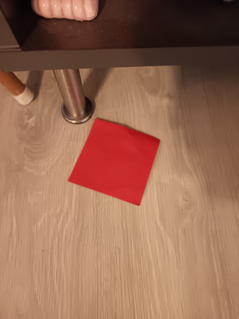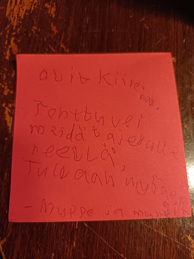 Lappu oli selvästi pudonnut pöydältä, ehkä kissa oli käynyt sen pudottamassa. Emäntä nappasi sen. Epäselvä käsiala oli Mupen. Lapussa luki: Olit kiireinen. Tonttu vei meidät ajelulle reellä, tullaan myöhemmin! -Muppe ja muut